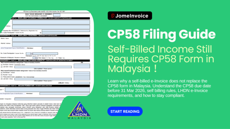 Learn why a self-billed e-Invoice does not replace the CP58 form in Malaysia. Understand the CP58 due date before 31 Mar 2026, self billing rules, LHDN e-Invoice requirements, and how to stay compliant.